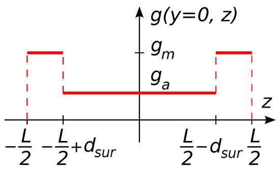 after substituting . Consequently, we find that the thermal model described in Section 2.1 can be easily adapted for predicting the temperature along the z direction. Looking at the axial cross-section of the investigated device (Figure 1), we see that the structure geometry is the same and boundary conditions exactly suit to the new situation, since thermally insulated side walls are replaced by thermally insulated mirrors. The only modification concerns the heat source function. The problem is complex and will be explained with details in the next section. Here, let’s only assume that is a symmetrical function as presented in Figure 3. Such a function can also be expanded into Fourier series (6) and coefficients take the form: