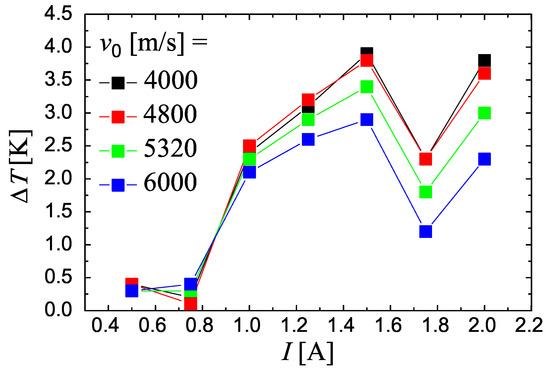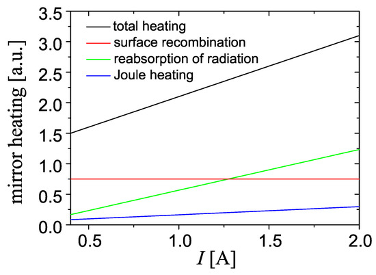 The value of can be assessed by combining the results of researches reported in [16,22]. Thorough experimental investigations in the latter work allowed for drawing functional relationships between mirror heating and pumping current. Originally both physical quantities are expressed in arbitrary units (see Figure 1 in [22]). In the further part of our work, they are successively transformed into W/m and Amperes, respectively. Plus, we reject the range below the threshold () as uninteresting from the thermal point of view.