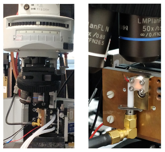 Photos of our experimental set. On the left, the microscope with thermoelectric temperature control is shown. Black and red cables power the Peltier element, while white hoses supply water for cooling. The operating current is supplied by the thick black cable through the SMA R/A adapter. On the right, the enlarged fragment with mounted device is shown. The front facet of the diode laser is at the bright white spot in the center. The illumination comes from the microscope objective.