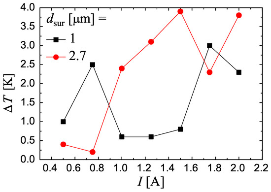 An essential part of our work was the verification of the proposed model. The calculations were carried out for the self-manufactured device, thanks to which we knew precisely many vital parameters, such as layer thicknesses, their chemical compositions, assembly details, etc. Using the micro-Raman spectroscopy, we measured the mirror temperatures for pumping currents in the range of and compared them with the calculated values (Figure 8). The observed discrepancies do not exceed 15 %, which we consider a very good convergence. This belief is confirmed by additional calculations motivated as follows. Even knowing the structure of a given laser thoroughly, it is difficult to determine some material parameters precisely. Analysis of vs I for the (quite likely) faster than expected surface recombination or shorter carrier diffusion length leads to even more accurate results, which are shown in Figure 9 and Figure 10.