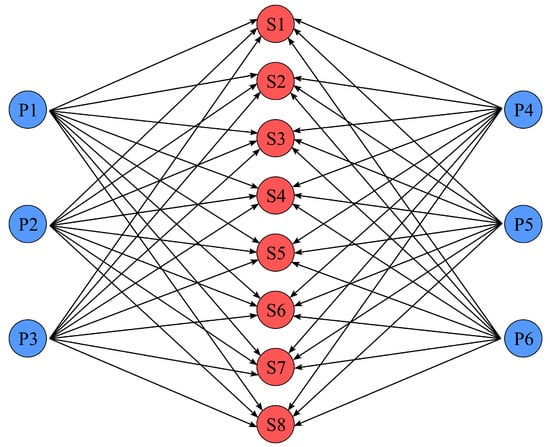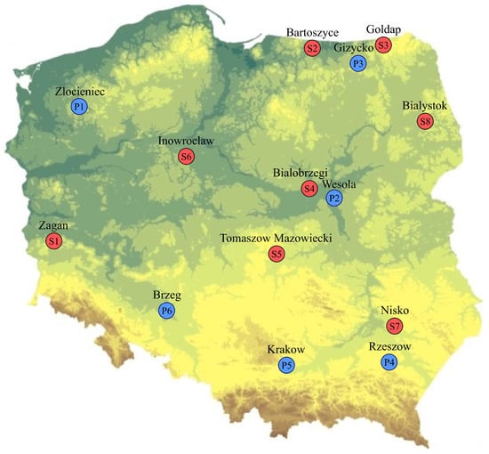 Six suppliers located in towns: Zlocieniec, Wesola, Gizycko, Rzeszow, Krakow and Brzeg have 24, 31, 19, 49, 40, 37 loading units, respectively. Eight recipients located geographically in the territory of the Republic of Poland presented in Figure 2 placed an order for 18, 29, 15, 34, 26, 21, 36, 21 loading units respectively. The transportation model was represented by the network shown in Figure 3. The arcs represent the routes linking the destinations and sources.