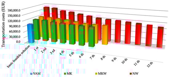 From a mathematical point of view, transportation problems have a wide range of applications in logistic systems [1]. Service network design problems arise wherever there is a need to determine cost minimizing routes and schedules, given the constraints on resource availability and level of service [2]. In [3], an agent-based simulation model studying the evolution of a coalition over time taking into account various trust-related issues was developed. Providing efficient distribution systems for services became a challenging issue for logistics companies. Mixed delivery approach, which combines attended home delivery (AHD) and shared delivery locations (SDL) usage in an innovative way, was proposed in [4]. In real-life situations, the traditional transportation problems deals with issues such as transportation costs, selection of delivery routes, selection of production places, or reduction of carbon emissions [5,6,7,8]. Indeed, it is necessary to plan the transportation of materials within the supply network rationally and optimally [9]. In the case of a balanced transportation problem, the balance between supply and demand is assumed. Due to the practical nature of the problem and the effectiveness of the methodology, the transportation algorithm is often used [10,11,12]. The paper [13] is concerned with the design of efficient exact and heuristic algorithms for addressing a bilevel network pricing problem, where demand is a nonlinear function of travel cost. Metaheuristic approach for solving transportation problem with fixed costs associated to the routes was presented in [14]. In distribution networks, rational transport management also requires organizational efforts related to the dynamics and type of tasks [15,16,17]. The costs of transport tasks should be optimized using methods and tools used not only in commercial solutions [18,19,20]. The literature often addresses cases aimed at developing the most effective method of solving transportation problems according to time or cost, while using the available IT tools [21,22]. In the paper [23] one of the first basic transportation problem was formalized, which was then further developed in [24], and then expanded even more in [25] by using the simplex method. There are a number of methods leading to a basic feasible solution to the transportation problem. The most common methods used to support the decision making process are: the northwest corner method, the row minimum method, the least cost in the matrix, and VAM method (Vogel’s Approximation Method).