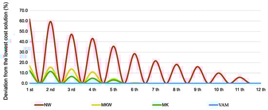 An innovative method of solving the transport problem based on the northwest corner method is described in the paper [26]. The authors, by deliberately modifying the cost matrix before applying the northwest corner method, proved that the proposed solution positively influences the effectiveness of the method by reducing the number of iterations performed. In [27], an analysis was made of the number of steps necessary to determine the optimal transport problem using the northwest corner method, the minimum cost method, and the VAM method. The subject of the research were transport cost matrices with dimensions of , while the values of supply and demand were generated in a random way from a set of numbers from 5 to 50,000. On the basis of the obtained results, it was found that the number of iterations required to obtain an optimal solution when using the northwest corner method in the case of matrices with dimensions of is as much as six-times higher than when using the minimum cost method or the VAM method. In [28], an alternative method of solving the balanced transport problem, so-called TCM (Tuncay Can Approximation Method), based on the geometric average of transportation costs, was used. A novel method called KSAM (Karagul–Sahin Approximation Method) used to find an initial solution to the transportation problem was proposed in [29]. The solutions obtained by KSAM were as good as the solutions obtained with the VAM method and as fast as the northwest corner method. In [30] the MOMC method (Maximum Supply with Minimum Cost) was used and the results were compared with three classical methods, i.e., the northwest corner method, the minimum cost method and the VAM method. The MOMC method provides a solution that minimizes the objective function and offers a computational advantage in the form of faster data processing and reduced memory usage. The article [31] analyses the VAM method and proposes how to improve it by using the total alternative cost matrix and alternative allocation costs. Both parametric and nonparametric statistical tests available in the MINITAB-15 statistical package were used in the calculations. In [32], the limitations resulting from the use of the Vogel approximation were discussed and an improved LD-VAM algorithm (Logical Development of Vogel’s Approximation Method) providing a lower objective function value than the VAM method was developed. The paper [33] proposes an ATM (Allocation Table Method) method leading to a basic feasible solution with a lower transportation cost than the solution obtained with traditional algorithms.