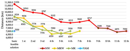 The calculations show that the basic feasible solution determined by the northwest corner method required the longest route of 11,226.0 (km). The optimal solution in terms of transport cost determined by the northwest corner method was not optimal in terms of total distance traveled. In the case of the least cost in the matrix method, the shortest distance required to complete the transport task equal to 6597.0 (km) was obtained as the result of the fifth iteration of the potential method. Of all the methods considered, the shortest route equal to 6559.0 (km) corresponded to the fourth iteration of the potentials method applied to the basic feasible solution determined by the row minimum method. A graphical interpretation of the results obtained is shown in the Figure 7.