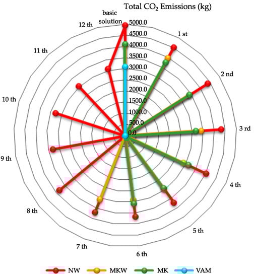 Implementation of the transport plan in accordance with the basic solution determined by the northwest corner method is associated with the highest CO emissions of 4939.4 (kg). From an environmental point of view, the optimal solution offering the lowest CO emission of 2886.0 (kg) was obtained using the row minimum method as a result of applying the potentials method four times. The resulting solution leads to a reduction in total CO emissions by as much as 2053.5 (kg). The results of the performed calculations are shown in Figure 8.