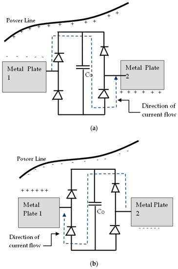 The schematic of the proposed circuit arrangement is shown in Figure 2. Two metal plates, metal plate 1 and metal plate 2, are connected to a bridge rectifier as shown in the figure. The circuit is placed close to a live power line in such a way that metal plate 1 is closer to the power line than the metal plate 2. The voltage in the power line induces fringing electric fields between the metal plates and the power line. Due to the induced charges in the metal plates, there will also be fringing field between the plates and the ground/earth. The fringing electric fields are shown by the dotted lines in the figure. The fringing electric fields can be represented as stray capacitances in a circuit representation. In Figure 3a, vs. is the voltage of the power line and the stray capacitances between the metal plate 1 to the power line and the ground are represented by the capacitors CL1 and CG1, respectively.