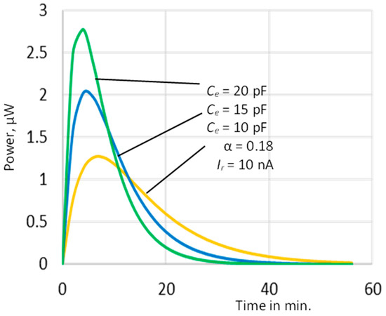 In Figure 6 the simulated results for the optimum voltage (voltage for maximum power) with the variation of the capacitance Ce are presented for a given value of Ir and α. Higher values of capacitor effectively means a higher degree of coupling from the electric field of the power line and we expect to get higher current in the circuit. This makes the value of the optimum voltage higher. If we consider Figure 5, it is clear that the circuit reaches the maximum power point quicker for higher values of Ce. In Figure 6, we show the simulated results due to the variation of optimum voltage for different values of Ce. The expression for optimum voltage Vom, as given in Equation (16) shows that the term containing 1/Ce has a negative coefficient and the trend of the graph in Figure 6 is an expected one. Although we have used the same value of α for all the different values of Ce, we expect the value of α to change with the change in the value of Ce.