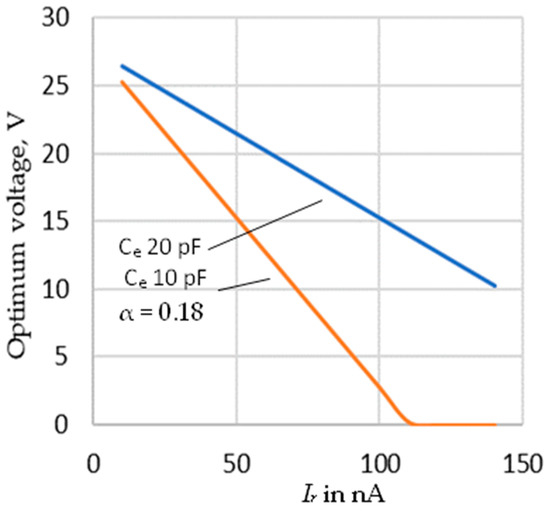 Figure 7 shows that variation of optimum voltage due to the variation of the diode reverse current. Keeping the values of the Ce same, any increase in Ir deceases the optimum voltage and there comes a value of Ir when no voltage will be developed in the capacitor C0. In the graph for Ce = 10 pF, the value of the voltage goes to zero when Ir exceeds 110 nA. Under such a condition, the discharge current Ir from the diodes becomes high compared to the charging current from the capacitor Ce. That is why we can see that for a higher value of Ce, the optimum voltage does not go to zero while a lower value of Ce shows such a behavior.