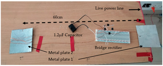 Picture of the experimental setup is shown in Figure 8. The live wire was a thin insulated copper wire fixed along the edge of the table (left edge of the table in the figure). The voltage in the live wire was 220 V 50 Hz and was drawn from single phase supply line. Two 4”× 4” metal plates, one placed close to the live wire of a power line and the other at a distance farther from the wire. The metal plates, 4 diodes in a full bridge rectifier and a 1.2 μF capacitor as C0 was connected on a bread board in accordance with the circuit configuration shown in Figure 1. In the figure, the metal plate 2 is placed at distance of 60 cm from the live wire.