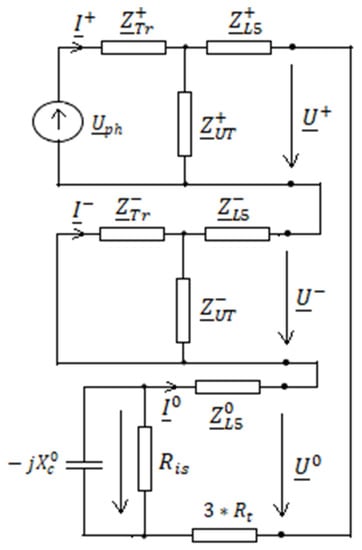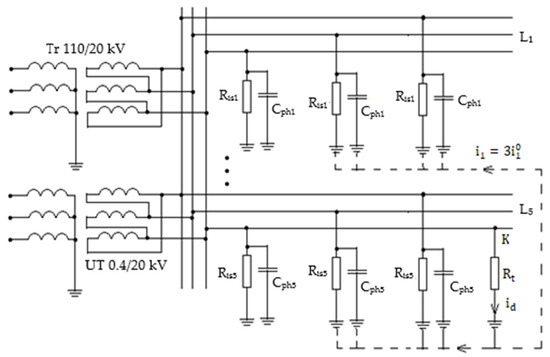 The equivalent diagram of the medium voltage network in which the single line-to-ground fault occurs is shown in Figure 2.