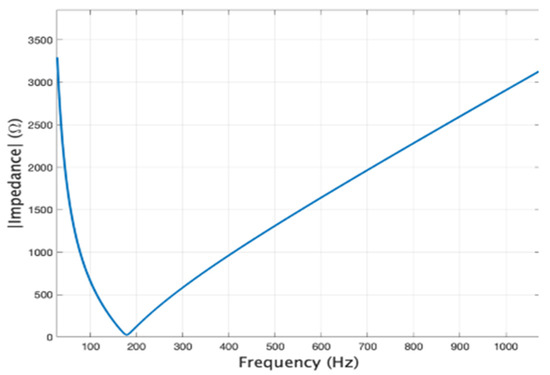 Using the MATLAB programming environment, the dependence of the equivalent impedance value () as a function of frequency was plotted by considering different values for the fault site resistance (): 3.5 Ω (Figure 4), 50 Ω and 100 Ω (Figure 5), 5000 Ω and 10,000 Ω (Figure 6).