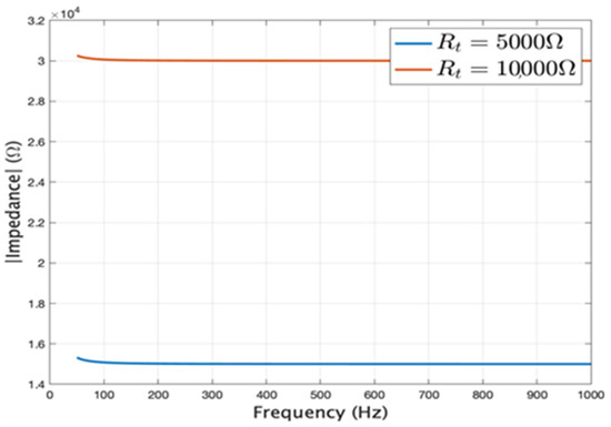 Dependence of equivalent impedance on frequency for Rt = 5000 Ω, respectively 10,000 Ω.