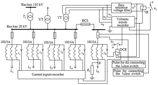 The fault is caused on line in Figure 7. The circuit-breaker switching command of the line on which the fault is caused is performed by a special device designed to perform measurements in 20 kV installations. To avoid fault extension during the experiments, the control device also generates the impulse for disconnecting the circuit breaker of the faulted line if the protections of this line do not detect the fault. Also, in case of refusal of the disconnection of the circuit breaker of the faulted line, the controller generates an impulse to command the disconnection of the BCS longitudinal coupling circuit breaker in Figure 7.