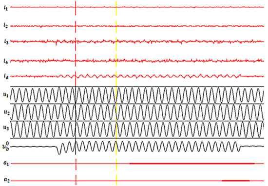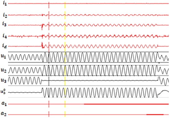 Measurements were made considering the following values for the resistance at the fault site: 3.5, 5000 and 10,000 Ω, respectively. The waveforms obtained are shown in Figure 8, Figure 9 and Figure 10. The directional current relay is so set that it operates if the direction of the zero-sequence current is from the transformer substation bus bar to the fault location and does not operate if the direction of the zero-sequence current is reversed.
