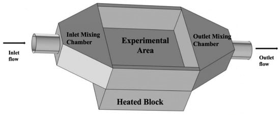 This paper examines fluid performance for different configurations towards experimenting. Figure 1 presents the overall model under investigation. The numerical setup consists of an inlet pipe, a mixing chamber, a flow-through insert (not shown in Figure 1), and finally, an outlet for the fluid exiting from the opposite side. The bottom of the plate is in direct contact with an aluminum block heated with thermal resistance (contact is called the interface). The empty chamber where the insert is located has an external length of 37.8 mm and a height of 12.7 mm. The wall thickness of the chamber is 3.557 mm. Straight mini channels insert will be used to investigate the flow effectiveness in extracting as much heat as possible. Aluminum is used in our modeling to match the prepared experimental setup. The fluid enters with a velocity uin and a temperature Tin. The temperature is measured numerically 1 mm below the so-called interface located at the center of the block. It is at this location where the experimental setup location of the thermocouples is. Water is the fluid circulating thus Table 1 shows the physical properties of the water.