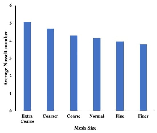 A normal-level mesh will be suitable to be used in the COMSOL model since the average Nusselt number difference between the normal, fine, and finer mesh is less than 4%.
