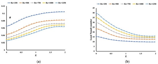 Finally, the temperature in the solid part of the model is studied by solving the heat conduction formulation. The local Nusselt number is known as the ratio of the convective heat coefficient multiplied by the characteristic length over the water conductivity (i.e., ). So, based on the non-dimensional adopted earlier, it becomes the inverse of the temperature. Thus,