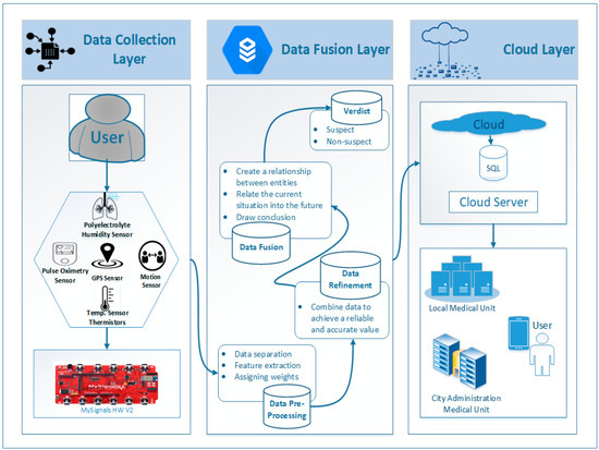 The proposed FLCD comprises three layers, i.e., data collection layer, data fusion layer, and cloud layer. In the data collection layer, raw data related to symptoms are first collected from sensors. Feature extraction and weight assignment to each sensor datum are done in the data pre-processing pipeline. The pre-processed dataset is then passed through the fusion algorithm that is used to normalize the data for in-memory or edge processing. After data analysis, a verdict is provided that explicitly tells whether a person is a COVID-19 mildly infected, seriously infected, or in a critical situation, or not infected by the virus at all. Data collected from sensors with generated verdicts are stored in the cloud database, accessible for users, local medical units (hospital/doctors), and city administration medical units. This data helps the user keep track of his symptoms and take precautionary measures to protect himself from virus contamination. It enables the doctor to decide what necessary actions need to be taken for the person. The city administration can predict the spread of the virus and keep track of the whole city’s population and make decisions about the lockdown.