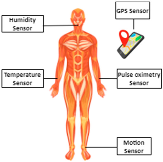 To measure the vital symptoms of a person wearing sensors, MySignals HW V2 is used [37]. MySignals is a development platform for medical devices and E-Health applications. It supports various biomedical sensors to monitor biomedical parameters, i.e., respiratory rate, heart rate, blood pressure, body temperature, and ECG signal. To handle different sensors, it relies on the Atmega 328 (Arduino UNO) microcontroller and enables smart devices to communicate with it through the BLE module and built-in Wi-Fi. An illustration of sensors attached to the body is presented in Figure 3. A temperature sensor, pulse oximetry, motion sensor, and humidity sensor are wearable sensors attached to the body, while the GPS sensor is available in the mobile phone. However, the cheapest solution is to utilize the sensor available in the mobile phone. Wearable sensors may create a feasibility issue; however, all these sensors are available in a modern smartphone. The user can easily check the temperature, heart rate, oxygen saturation, and respiratory rate with mobile phone sensors and motion sensor can monitor the social distancing, while GPS sensor available in the phone is used in both cases.