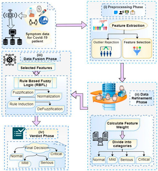 The fusion layer consists of four phases, i.e., data pre-processing, data refinement, data fusion, and verdict generation. In the data pre-processing phase, features are extracted, i.e., Location, Time, Temperature, Heart Rate, Respiratory Rate, SpO2, and Social Distance. The extracted features are separated from irrelevant data and assigned weights. In the data fusion phase, the weighted features are passed through the rule-based fuzzy logic classifier to normalize the data so that a verdict can be made. Edge processing is used because the proposed framework works on real-time data that requires minimal convergence time and minimal computational resources [38]. After fusing the data, it is compared with a threshold value, and if the fused value is beyond the threshold value, a mild, serious, or critical verdict is produced that indicates a particular user is a suspect of COVID-19. If the fused value is under the threshold value, a normal verdict is produced, which suggests that a person is not a suspect of COVID-19.