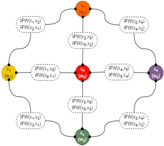 Feature ranking is accomplished by using the Feature Connectivity Graph (FCG) [47]. An undirected partially connected FCG graph can be used to show the feature weights and the strength of the connection between each feature and its friends. Just like all other graphs, FCG graphs are also represented as FCG = (V, E), where V represents the nodes, and E represents edges. Figure 5 presents the FCG by considering the feature set X = (x1, x2, x3, x4, x5) and weights set W = (w1, w2, w3, w4, w5). The relationship between nodes is the weight matrix represented by the Inter Feature Weight (IFW).