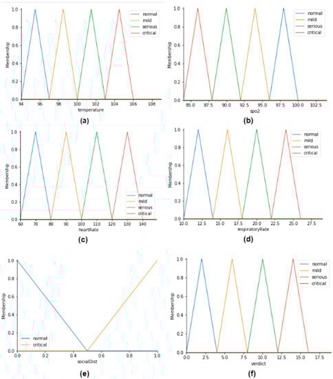 The membership function for (a) Temperature, (b) SpO2, (c) Heart Rate, (d) respiratory Rate, (e) Social Distancing, and (f) verdict.
