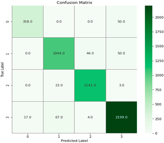 To calculate the performance matrices, a confusion matrix is applied, which is presented in Figure 8. The confusion matrix is usually used to see the performance of a binary class; however, it can also be used to analyze the performance of a multiclass supervised learning problem by creating a multiclass matrix. In this case, four classes are available, so a 4-by-4 matrix is created: 4 × 4 = 16 values representing True Positive (TP), False Positive (FP), True Negative (TN), and False Negative (FN). Each column in the matrix shows the instances in the computed and predicted classes, while each row in the matrix shows the instances in the true or actual classes. A list of values is then computed from the confusion matrix for the given classifier, which includes precision, accuracy, misclassification rate, and prevalence.