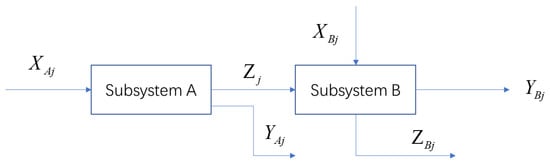 The undesirable output here is still converted to desired output by the method of linear function transformation. , , and respectively represent the inputs of the A subsystem, the expected outputs, and the treated undesirable outputs, and , , and represent the slack variables corresponding to them, respectively. , , and separately represent the inputs of the B subsystem, the expected outputs, and the processed undesirable outputs from the A subsystem as inputs enter into the B subsystem. Furthermore, , , and represent the relaxation variables corresponding to them, respectively. and respectively represent the strength coefficients of the two subsystems in the same DMU.