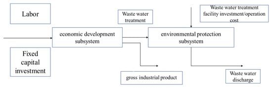 Figure 2. Each region can be regarded as a DMU. Here, subsystem A is an economic development subsystem, subsystem B is an environmental protection subsystem, and B deals with the pollutants produced by A in industrial production and gets the final pollutants. Any industry would cause some inevitable pollution during production and try their best to deal with the pollution so that it would reduce the impacts on the environment. The inputs of the subsystem A include labor and fixed capital investment, which are the main inputs in industry, and A’s output includes expected output (gross industrial product) and undesirable output (industrial wastewater). The inputs of subsystem B include the investment and operating costs of industrial wastewater treatment facilities, and the output of subsystem B is final industrial wastewater discharge. We integrate the facilities inputs of subsystem B as a box in