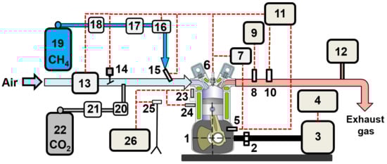 Engine load and crankshaft speed were controlled using the engine load stand AMX200/100, with an accuracy of 0.9 Nm. Intake air mass was measured using a Bosch HFM 5 m with an accuracy of 2%. Composition of biogas recreated using two separate cylinders of CH4 (purity of 99.9995%) and CO2 (purity of 99.995%). Methane was port injected through the injectors marked as 15 (Figure 1) and carbon dioxide was premixed with intake air. Mass flow of gas was measured using two separated Coriolis-type Rheonik RHM 015 mass flowmeters with a measuring range of 0.004–0.6 kg/min and accuracy of ±0.10%. A schematic diagram of the engine test bench and measuring equipment is presented in Figure 1.