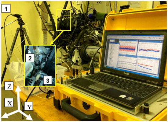 The sound pressure of the working engine was measured using a Gras 46AE free-field microphone (frequency range: 3.15 Hz to 20 kHz; dynamic range: 17 dB(A) to 138 dB; sensitivity: 50 mV/Pa). Engine vibration was measured in longitudinal and transverse directions using two Bruel and Kjear 8341 CCLD accelerometers (frequency range: 0.3–10,000 Hz; sensitivity: 10 mV/ms–2). Figure 2 illustrates the layout of the sound pressure and vibration measuring equipment.