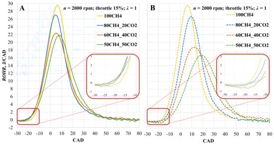 ROHR in the cylinder depending on simulated BG composition and ST. (A)—with optimal ST for mixture; (B)—with optimal CNG ST.