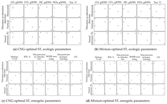 Vibration and sound pressure correlation to engine parameters. (a)—Ecologic parameters when CNG is optimal for ST; (b)—ecologic parameters when ST is optimal for mixture; (c)—energy parameter when CNH is optimal for ST; (d)—energy parameter when ST is optimal for mixture.