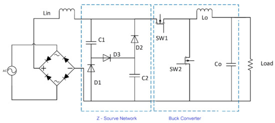 As discussed in the previous sections, to improve the power factor of the buck PFC circuits, the Z-source buck PFC circuit is proposed in [14] by adding a Z-source network in front of the buck converter. As seen in Figure 2, the circuit has two switches, SW1 and SW2. The losses arising in such a circuit are mainly as a result of conduction and switching, as well as due to the inductor at the input. Conduction losses are given by Equation (8) and the switching losses are given by Equation (9).