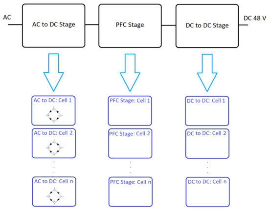 The Introduction Section of the work is followed by Section 2, which presents the structure of AC/DC 48 V power supplies. The section identifies and analyzes the three individual conversion stages and specifies single-stage and two-stage conversion alternative topologies. In Section 3, the multicell structure topologies are introduced and analyzed. This analysis is subsequently followed by Section 4, the experimental setup and verification. The proposed multicell buck PFC converter is presented in Section 5 and a technoeconomic analysis follows in Section 6. The last section of the paper, Section 7, is the conclusion.