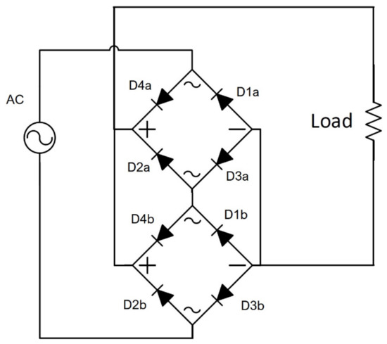 A multicell rectification can be constructed either with diodes or switches (MOSFETs or IGBTs, etc.), as previously mentioned. A strategy to minimize the losses in the rectification stage is to use parallel diode bridge rectifier systems [24]. Considering that each bridge circuit is a cell using multiple bridges, a multicell structure is formed. According to [24], parallel diode bridge rectifiers lead to lower losses because diodes with lower maximum current carrying capacity have less forward voltage drop, although this stands only for specific applications. The power losses are mainly generated as a result of the conduction and the switching of the diodes or the switches. Due to the low switching frequency (50 Hz or 60 Hz), the switching losses are almost negligible and the resultant losses of each of the two bridge rectifier legs arise mainly due to conduction. The use of IGBT switches would not benefit such systems since IGBT losses are similar and higher than diodes for similar power applications. GaN MOSFETs tend to have lower switching losses than silicon MOSFETs despite their higher conduction resistance (on-resistance RDS−On). For the diode case, the conduction losses are given by: