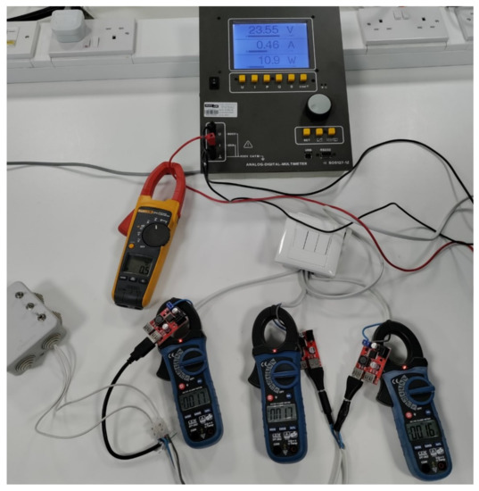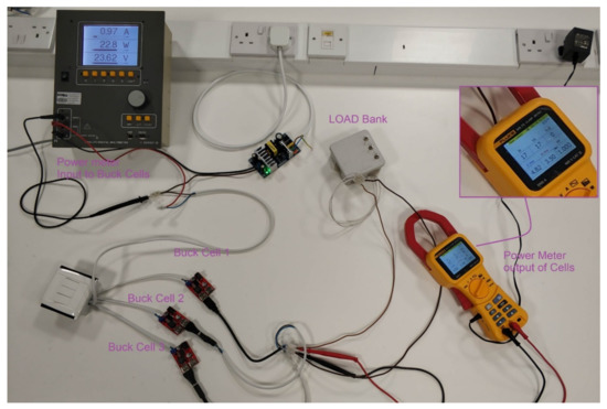 Initially the setup was simulated in PSIM thermal module (version 12.0.3.) for comparison of theoretical and experimental results. The setup consists of 3 buck converter cells, a 3-pole switch for switching of the 3 parallel cells, variable loads, and two power meters measuring input and output voltage, and current and power. The buck cells used are commercially available and they employ the LM2596 controller. A photo of the experimental setup is shown in Figure 5 and Figure 6, showing the respective schematic diagram. The input power meter used is a Lucas-Nuelle analog/digital multimeter, which is the wattmeter and power-factor meter model SO5127-1Z, which has a measurement accuracy of 2%, and a capability to work with voltages of up to 600 V and a current range of 0–20 A. The meter used in the output of the multicell conversion system is a Fluke 345 PQ meter with an accuracy in current measurements of ±0.2 A or ±1.5% and an accuracy of voltage measurements of ±1%. It is worth mentioning here that since the measurements with 3 cells, 2 cells and 1 cell are comparative, the efficiency improvement could easily be verified. As it can be seen in Figure 5, for 17 W load output, the power input with 3 buck cells is 22.8 W. For instance, at the same load (of 17 W) with 2 cells, the input power was 23.1 W. The voltage input to the 3 cells was 23.56 V and current input 0.97 A.