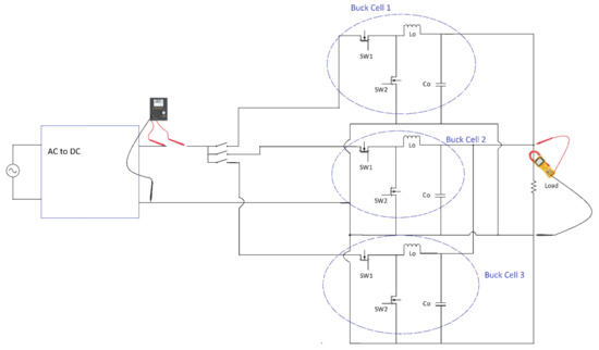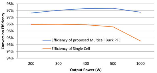 Initially, the AC to DC part of the multicell rectifier was simulated with the remaining parts of the PSU in a single-cell structure. The results are shown in Table 3. The results are very promising, since the load losses at 1000 W are considerably minimized. As expected, since, for both inductors and MOSFET switches, the main losses are due to the internal resistance (Rindutor and RDS−On, respectively), the three-cell buck PFC has significantly lower losses (since N(I/N)2 × R < I2 × R).