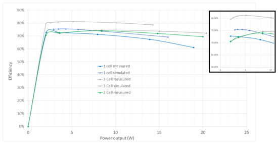 The efficiency of the single buck cell at different load conditions was measured, graphically analyzed and used as a baseline for energy efficiency. Following the experimental measurements with one buck converter cell, two and then subsequently three similar buck converter cells were used. Repeating the same methodology and measurement strategy, the load-efficiency curve was constructed, as seen in Figure 7. It is worth mentioning that the no-load consumption of one, two and three PFC circuits have an effect on the load-efficiency curves. As it can be seen in Figure 7, for loads corresponding to 10–20% of the full load (i.e., 1.8–3.6 W), the efficiency of one buck converter cell is higher than in the case with two and three buck converter cells. For instance, on 2 W load, the efficiency of 1 cell was 72.76% and with 3 cells it was 70.63%. Additionally, on 3.6 W load, the efficiency with 1 cell was 72.5%, with 2 cells 72.32% and with 3 cells 72.07%. This is due to the no-load losses of the PSU modules arising mainly from the inductors and the control circuitry. The no-load loss of a single buck converter cell is found to be 0.1904 W, that of two cells was equal to 0.238 W and for three cells 0.3094 W.