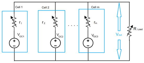 Equivalent simplified circuit of parallel DC cells connected to a common variable load.