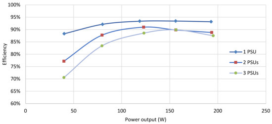 Efficiency against power output of 1, 2 and 3 PSUs working in parallel (with transformer).