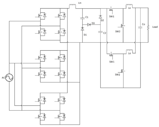 The two-stage solution includes the AC to DC boost PFC which converts the AC input voltage to 380–400 V DC and maintains input power quality, and a DC to DC step-down converter to step-down the voltage to the desired level. Due to imperfect switching (especially for high power applications), high switching losses occur in the converters. To step-down the voltage from 380–400 V to 48 V DC as previously described, a DC to DC step-down converter is needed. Since high energy efficiency and power density is required for such converter systems, the most commonly used low power (under 1 kW) converter circuit is the LLC half- or full-bridge converter [21,22,23]. These converters are resonant converters that adopt zero-voltage switching (ZVS) techniques in order to minimize switching losses, something that improves the efficiency of conversion. LLC half- or full-bridge converters, however, incorporate transformers in their structure, which creates no-load losses and therefore has low efficiency on low loads.