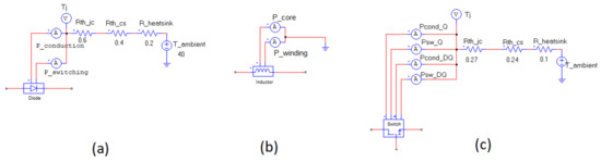 Equivalent circuits in PSIM thermal module for (a) diode, (b). inductor, (c). MOSFET.