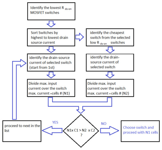 All switches should have a reverse voltage breaking capacity higher than the input voltage of the source. Since the price of the switches tends to be proportional to the output current, the flowchart in Figure 14 compares the system cost with the lowest cost switch and the system cost of a multicell structure with the lowest RDS−On switches. The solution with the lowest system cost is selected from the product of the number of cells and the cost of the switches.