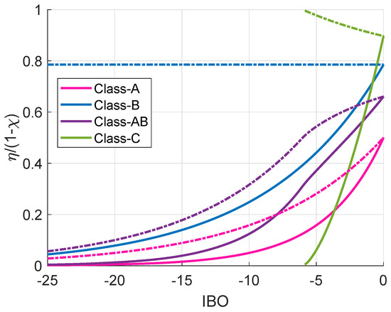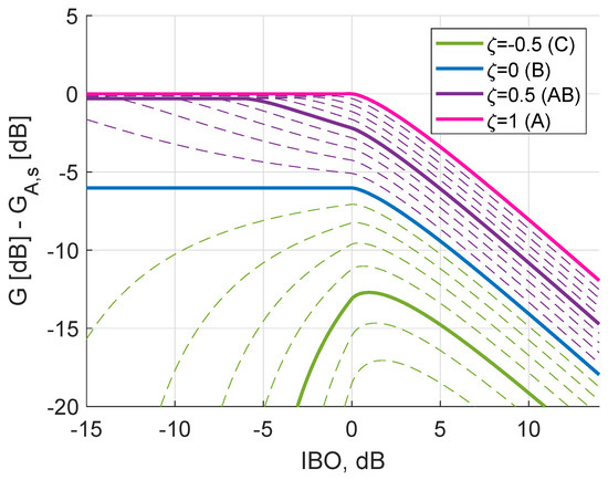 Figure 14, the load modulation approach ensures highest possible efficiency in back-off, for all biasing classes. In particular, for a class-B PA the efficiency becomes constant. Textbook Doherty PAs, using a class-B PAs as Main device, show in fact constant efficiency in the Doherty region [