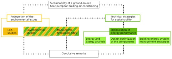 Our review summarizes the studies of current scientific literature investigating the environmental benefits and issues of GSHP systems for HVAC, analyzing their role in the decarbonization of the building sector and aiming at presenting a comprehensive view on their sustainability (Figure 1). In Section 2, we report the main results and remarks from the application of the LCA technique to different case studies. Section 3 discusses the main operative conditions and working principles which affect the sustainability of a GSHP system from a thermodynamic point of view. Finally, Section 4 investigates the environmental impact of a GSHP system as related to the climate, terrain, and other exogenous variables characterizing the installation site.