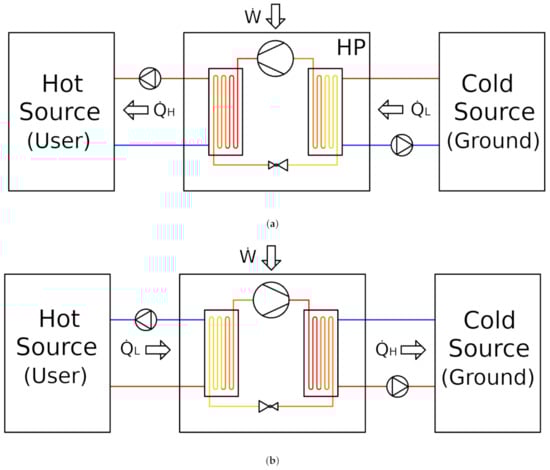 Ground-source heat pump working cycles in heating (a) and cooling (b) mode.
