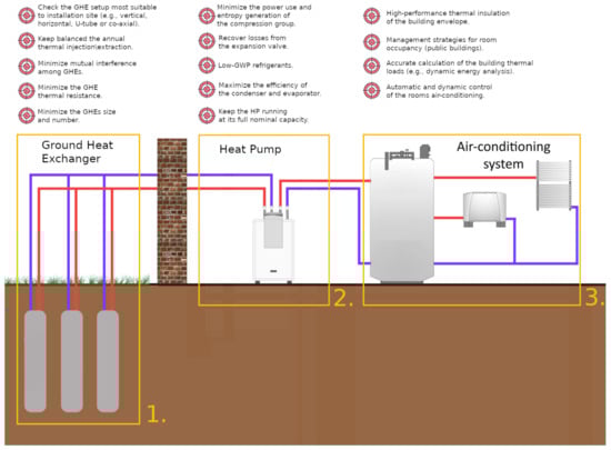 Components of a ground source heat pump: (1) ground heat exchanger; (2) heat pump; (3) the air-conditioning distribution system. Main optimization strategies emerging from literature are shown for each component.