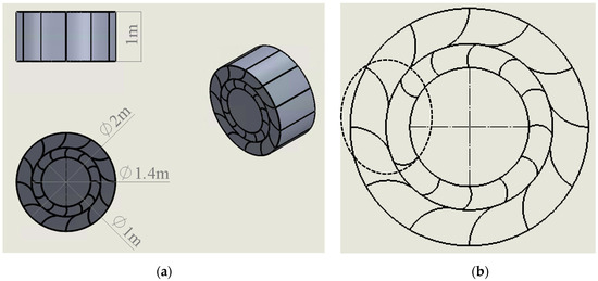 The VAWT used in the present study consists of 12 rotor and 12 stator blades, as shown in Figure 1a. This VAWT has been used in many previous analytical, experimental, and numerical studies by the author [17,21,22,23,24] and colleagues [11,12,13,14,15,16,18,19,20]. The core, rotor, and stator outer diameters of this VAWT are 1 m, 1.4 m, and 2 m, respectively, while the height (h) is 1 m. For the damaged VAWT, we have removed one of the rotor blades (see Figure 1b). Note that the geometric centres of the VAWT models throughout this study are at (0,0,0).