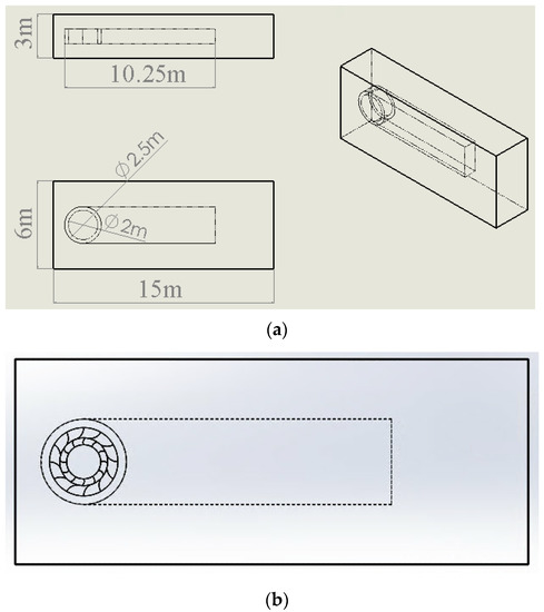 The dimensions of the flow domain were obtained after carrying out extensive initial numerical assessments, ensuring that the flow fields of the VAWT models (both healthy and damaged) do not interact with the boundary conditions, especially at the inlet, top/bottom, and sides of the flow domain. Based, on these results, the specified length, width and height of the flow domain are 15 m, 3 m, and 6 m, respectively, as shown in Figure 2a. The flow domain was divided into two sections, i.e., the inner and outer sections, in order to control the mesh quality and, thus, for accurately capturing the dynamic behaviour of the wake. Based on initial assessments, it was revealed that the wake region of a VAWT extends 4D downstream (D being the dimeter of the stator). Thus, the inner section of the domain is rectangular in shape with a cylindrical head, where the diameter of the cylindrical head is 2.5 m and the total length of the section is 10.25 m. The complete flow domain, including the healthy VAWT model, is shown in Figure 2b.